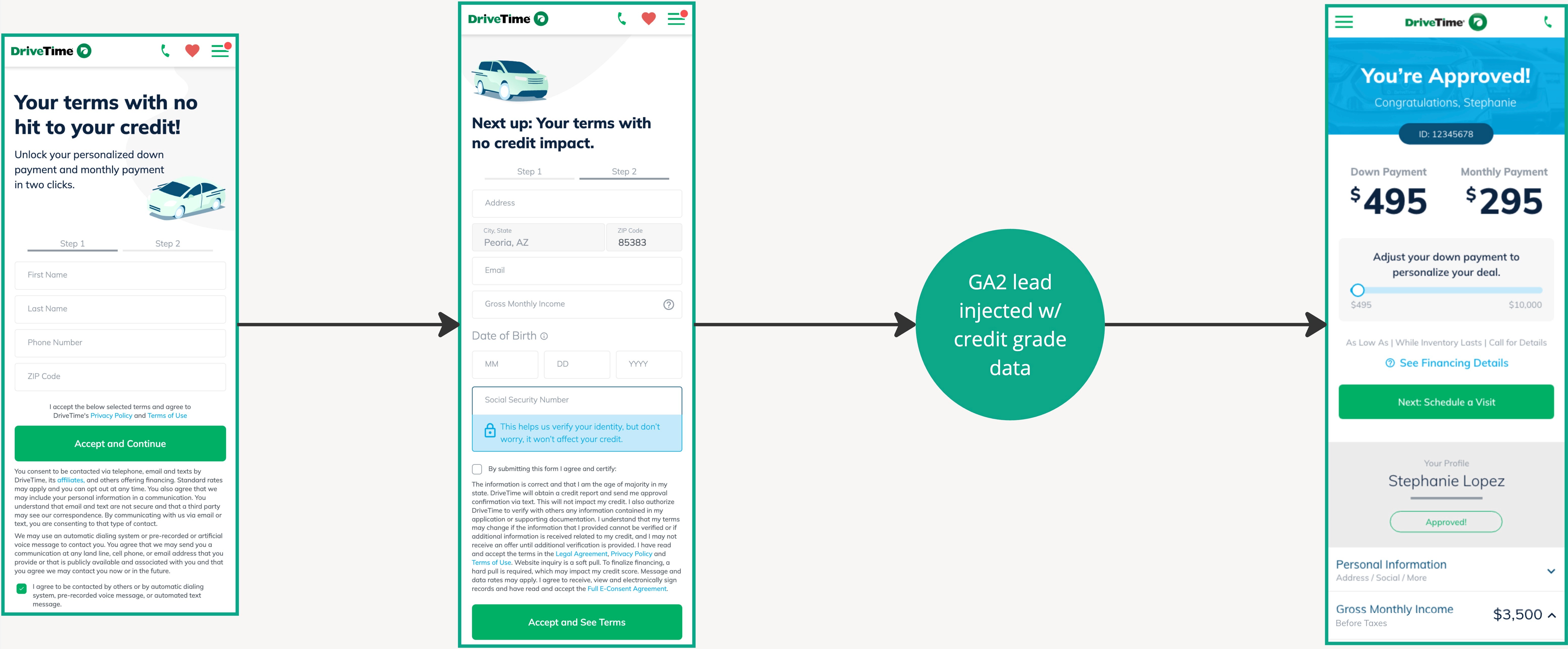 Prior to shopping vehicles with their personalized terms, the user must complete our Get Approved (GA) forms. If successful, they land on our Approval Certificate (App Cert) page where they are then prompted with their starting terms, which are pulled from the cheapest vehicle available to them. At the time, these terms were displayed simply as numbers with no car attached.