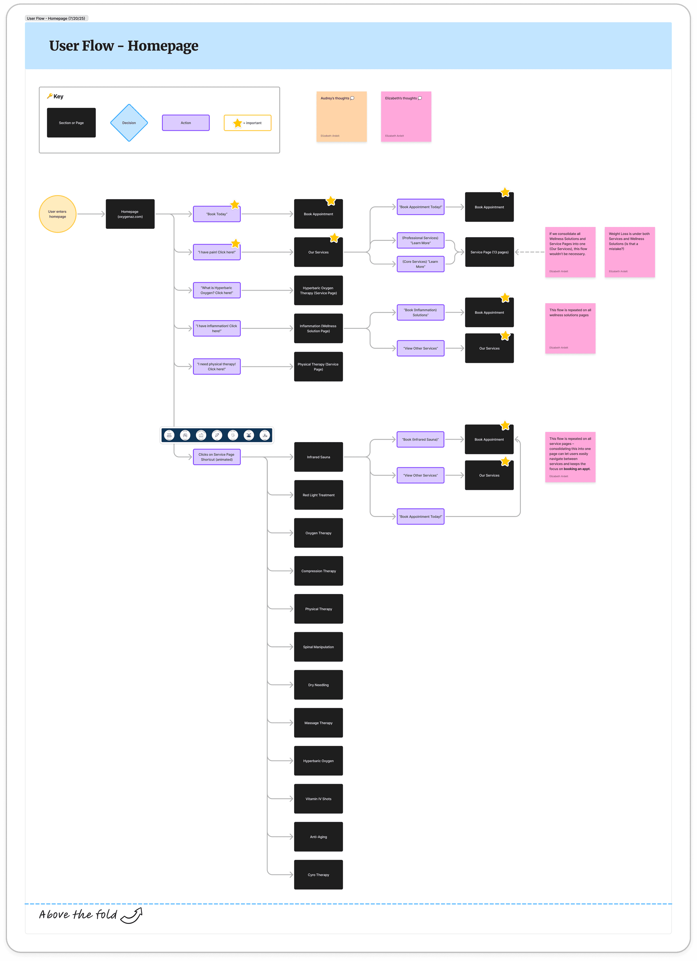Since the homepage acts as the main entry point to the rest of the site, I also mapped out a user flow to understand how users were being guided through content and services. This helped evaluate whether the structure was prioritizing the right paths for potential clients and prospects, and later served as a reference when comparing the before and after experience. It also surfaced smaller details, raised questions about the business, and highlighted opportunities for improvement early on.