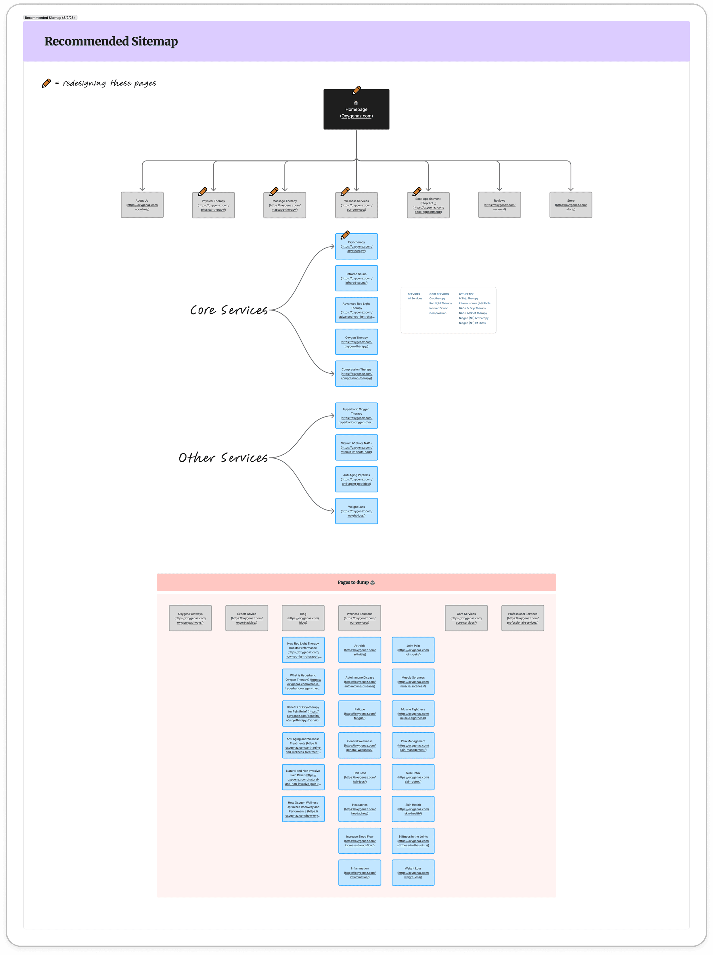 After reviewing the homepage, I mapped out the full site structure to better understand how all pages connected and how content was organized. This helped identify opportunities to simplify the experience — highlighting redundant pages, gaps in content, and areas where the structure could be improved. While exploring potential changes, I also considered SEO impact to ensure valuable content wasn’t lost.