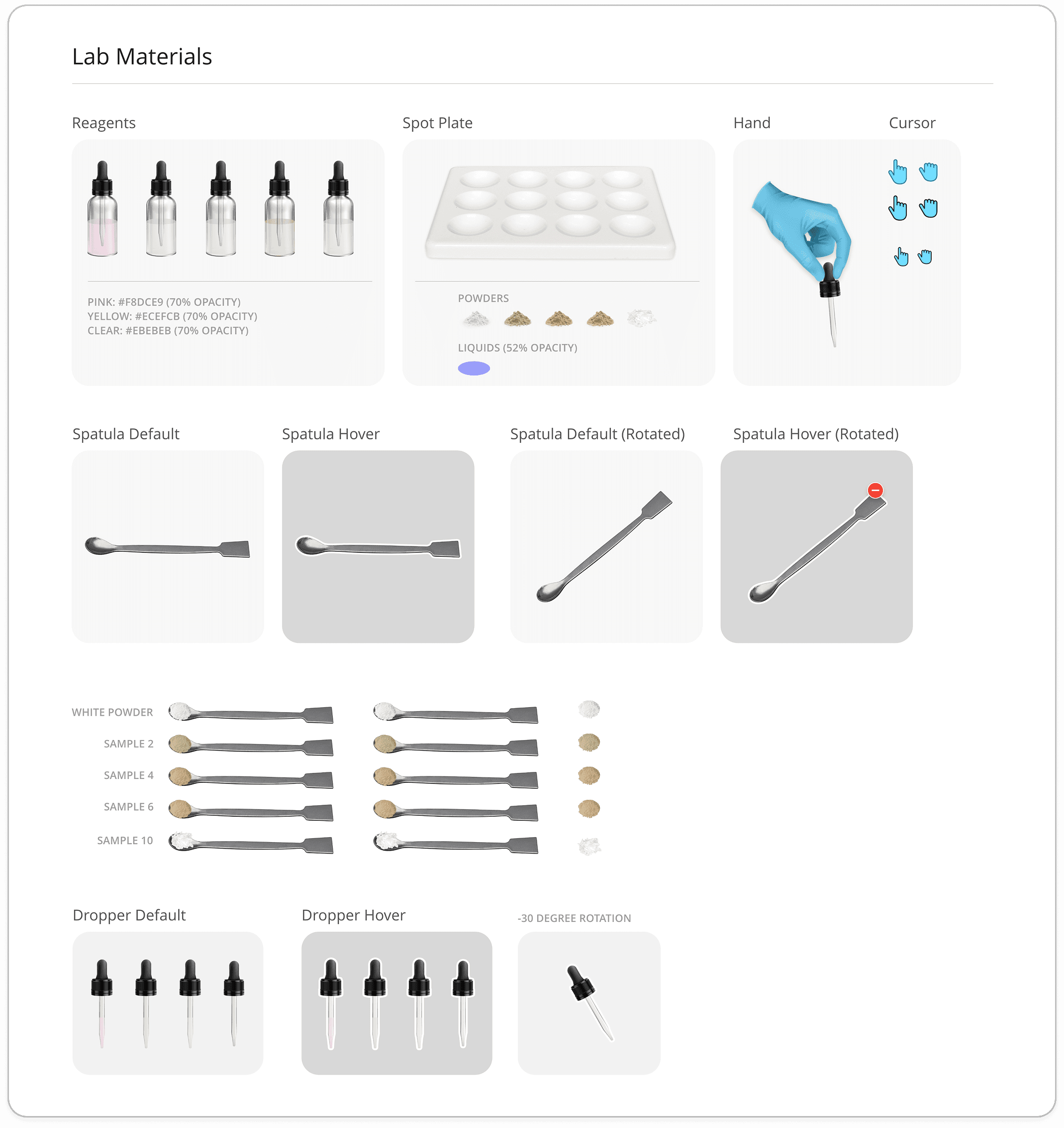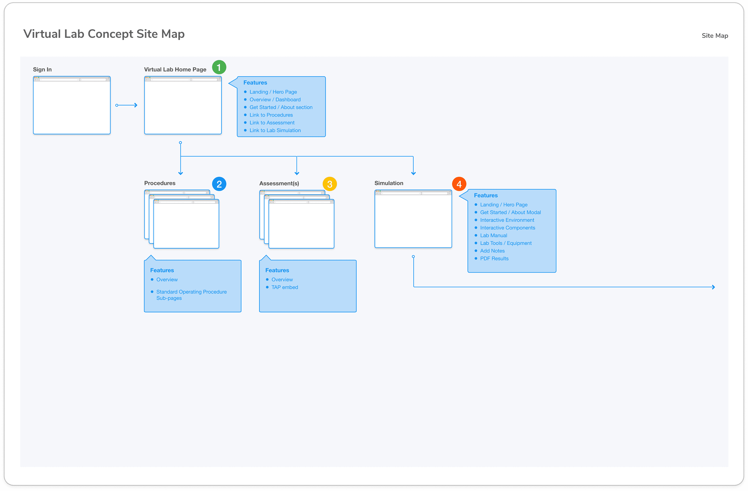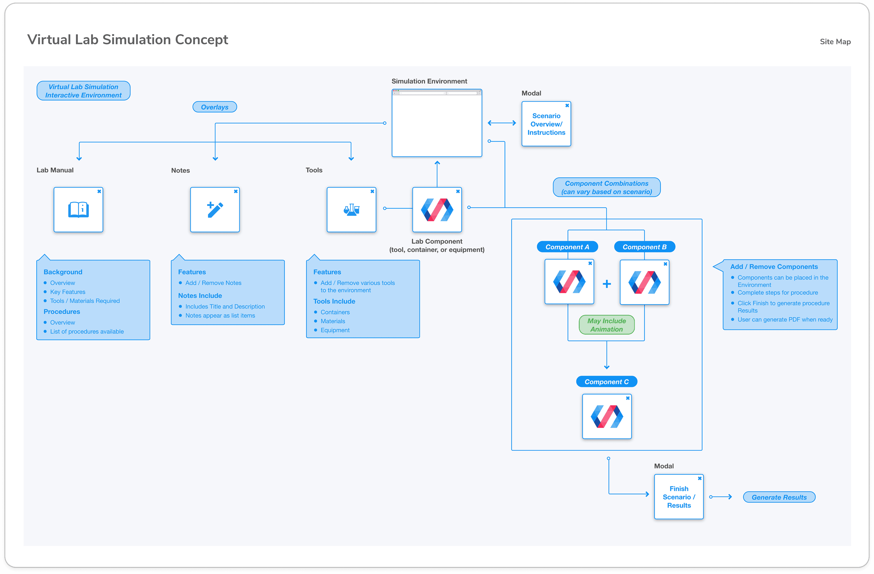 About a year prior to this project kickoff, virtual lab research had been done to prepare for simulations like this, experimenting with tools like Lottie files to build out interactive components. Because of this, much of the mockup work and framework for the development phase was completed, which significantly reduced the scope of this project.