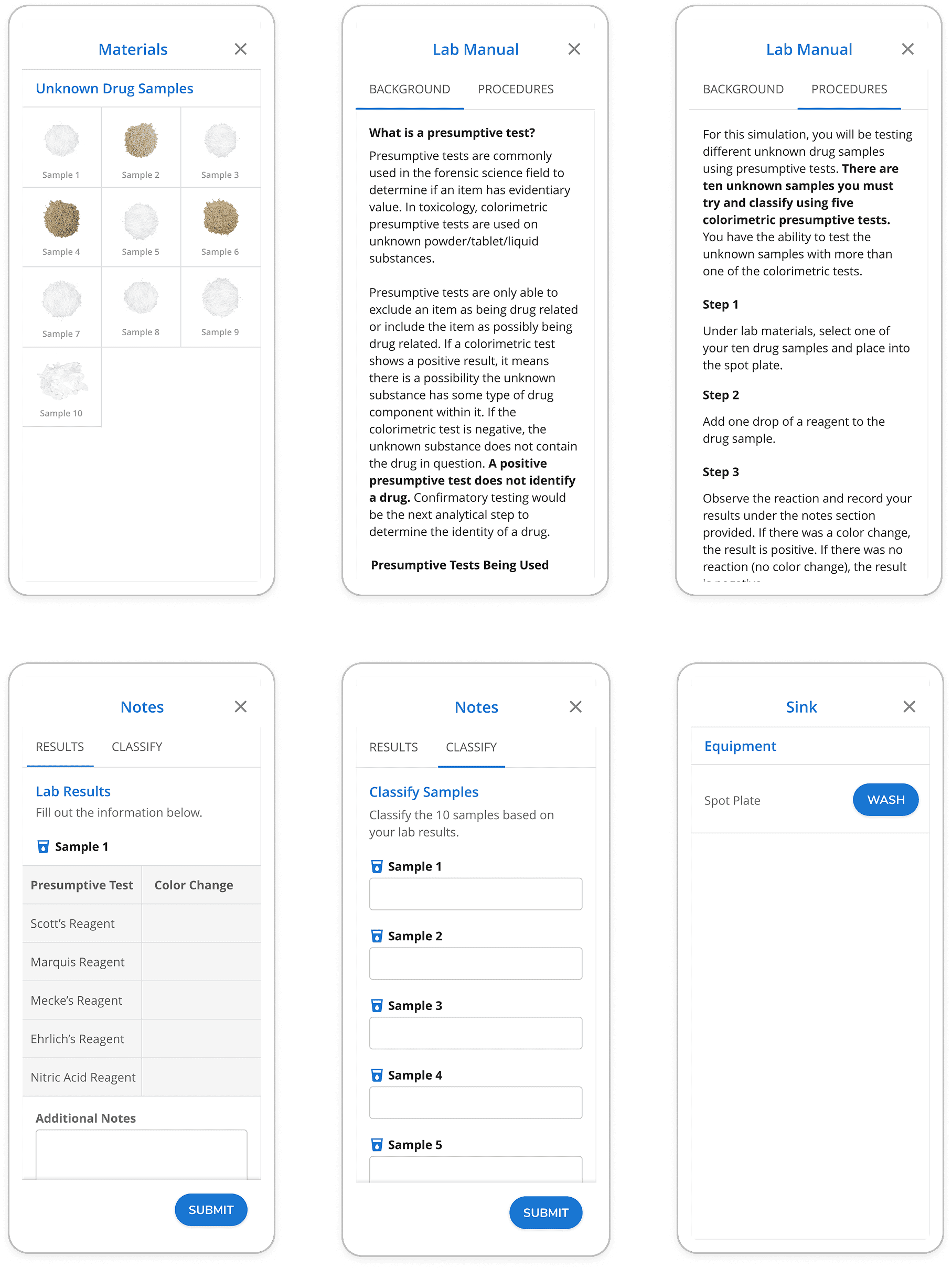 Build a new interactive simulation to one of the classes in the program. The simulation would create an interactive option for students to learn and conduct presumptive drug testing.